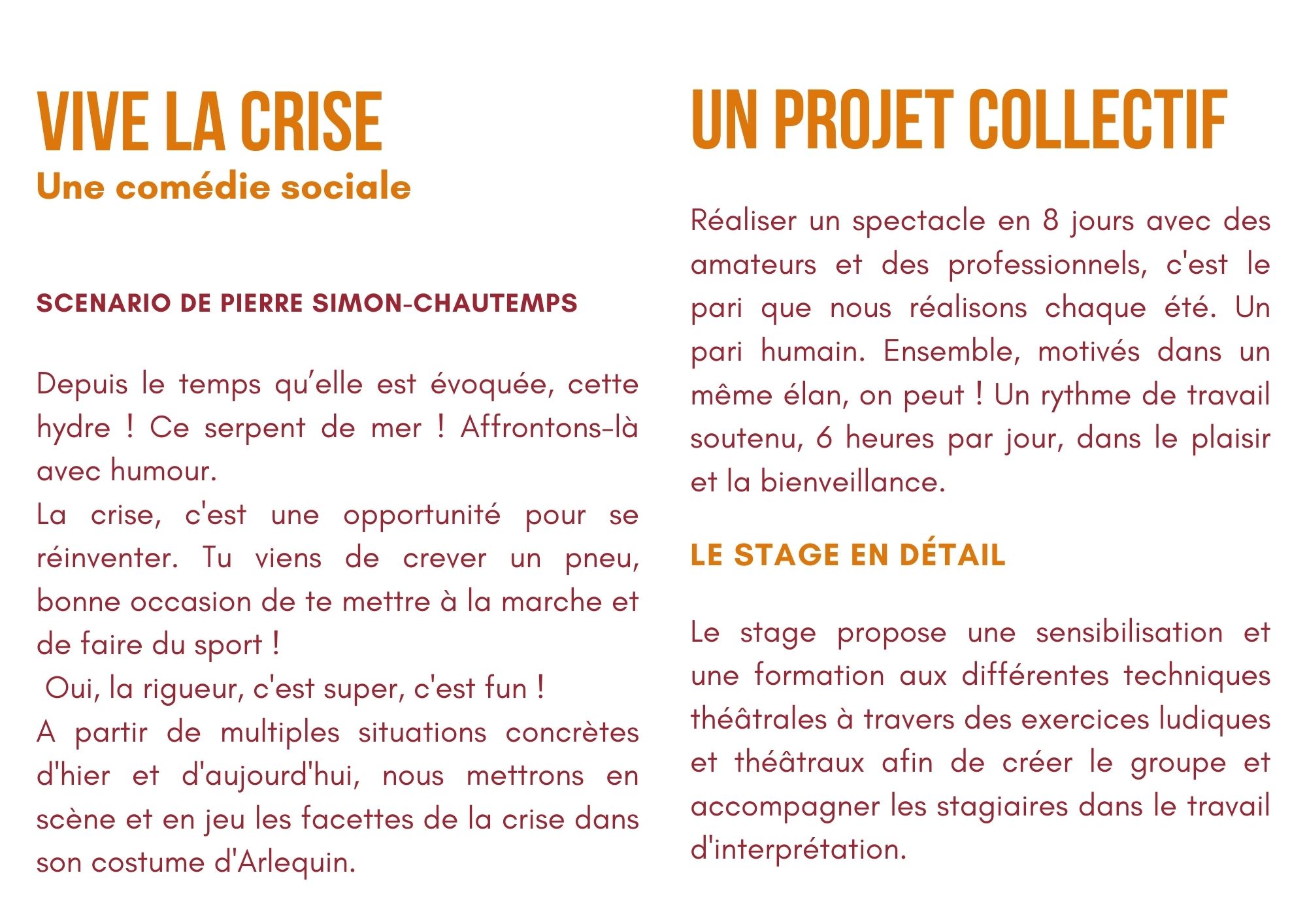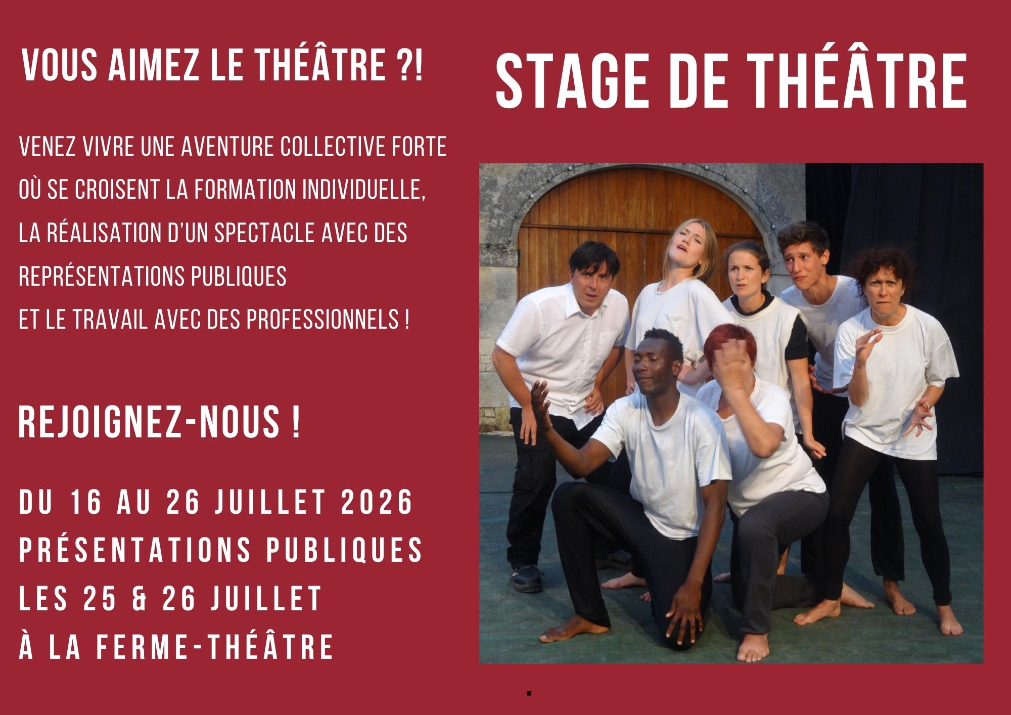 Des stages plus conséquents pendant l’été sont l’occasion d’une réelle immersion dans le milieu du théâtre. Les formateurs et les stagiaires se donnent pour but de réussir à construire un spectacle complet en une à trois semaines, et à le présenter au public à la fin de cette période de stage. C’est un réel défi compte tenu de ce laps de temps très court… jusqu’à présent, la pari à toujours été tenu !