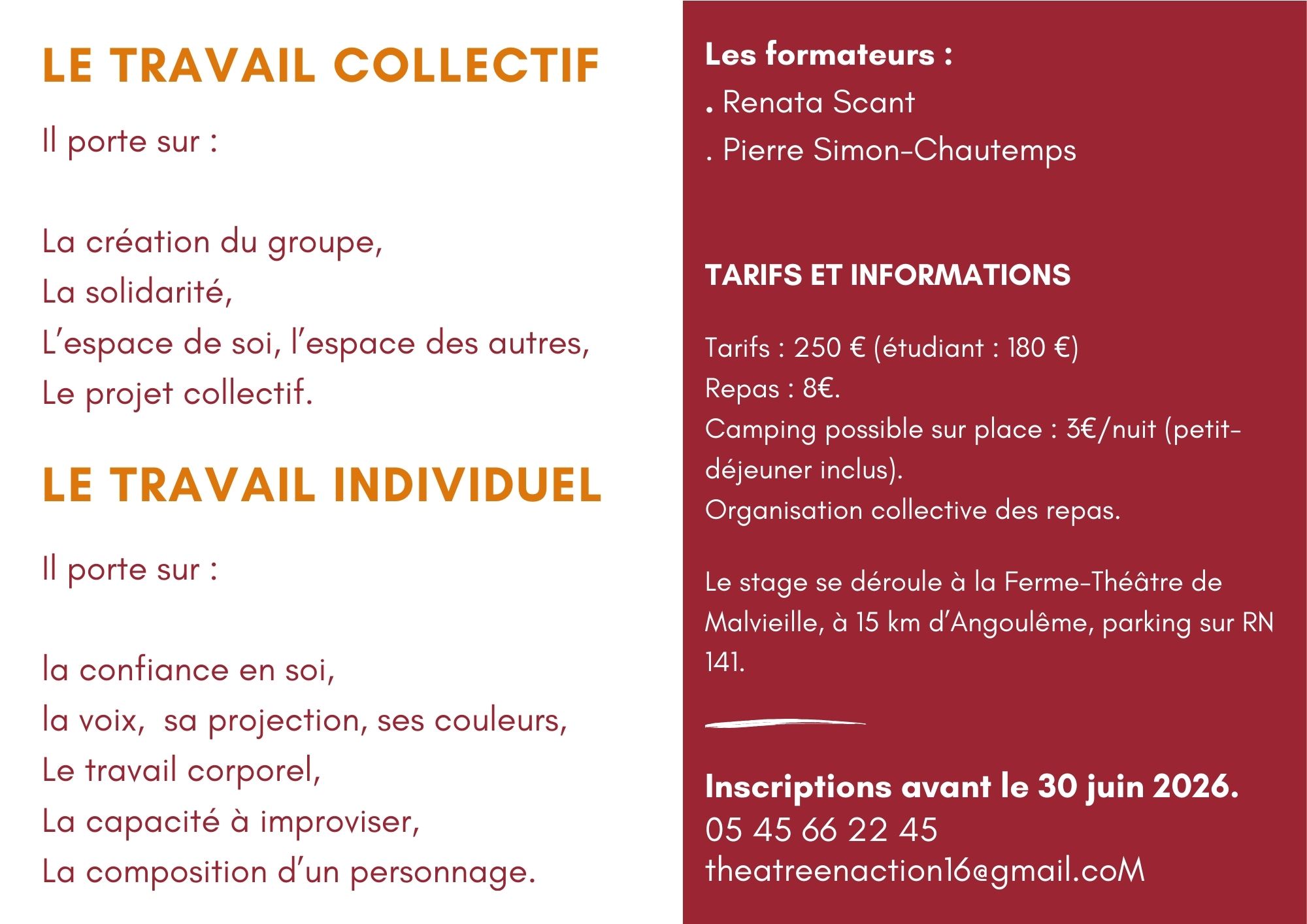 Chaque année, la cie Théâtre en Action propose différents stages, pour amateurs et professionnels, à la Ferme-Théâtre de Malvieille. Des stages de courtes durée (de deux à trois jours) permettent d’aborder des thèmes ciblés : la lecture à haute voix, la prise de parole en public, ou encore la versification.